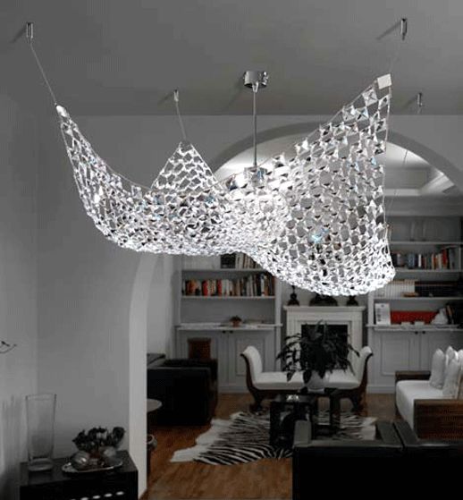 Lampada a sospensione (lampadario) della serie Kite di Marchetti con struttura in metallo nickelato lucido. La lampada ha una larghezza di 77 cm ed e' un pareo di cristallo che scende dal soffitto per offrire luce ed eleganza.