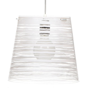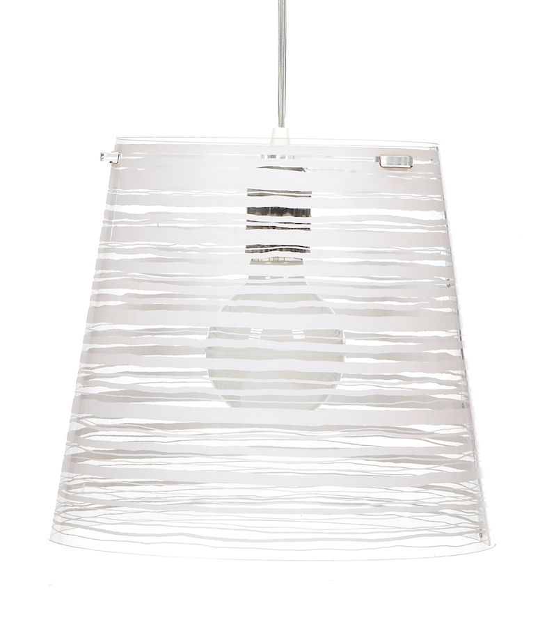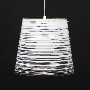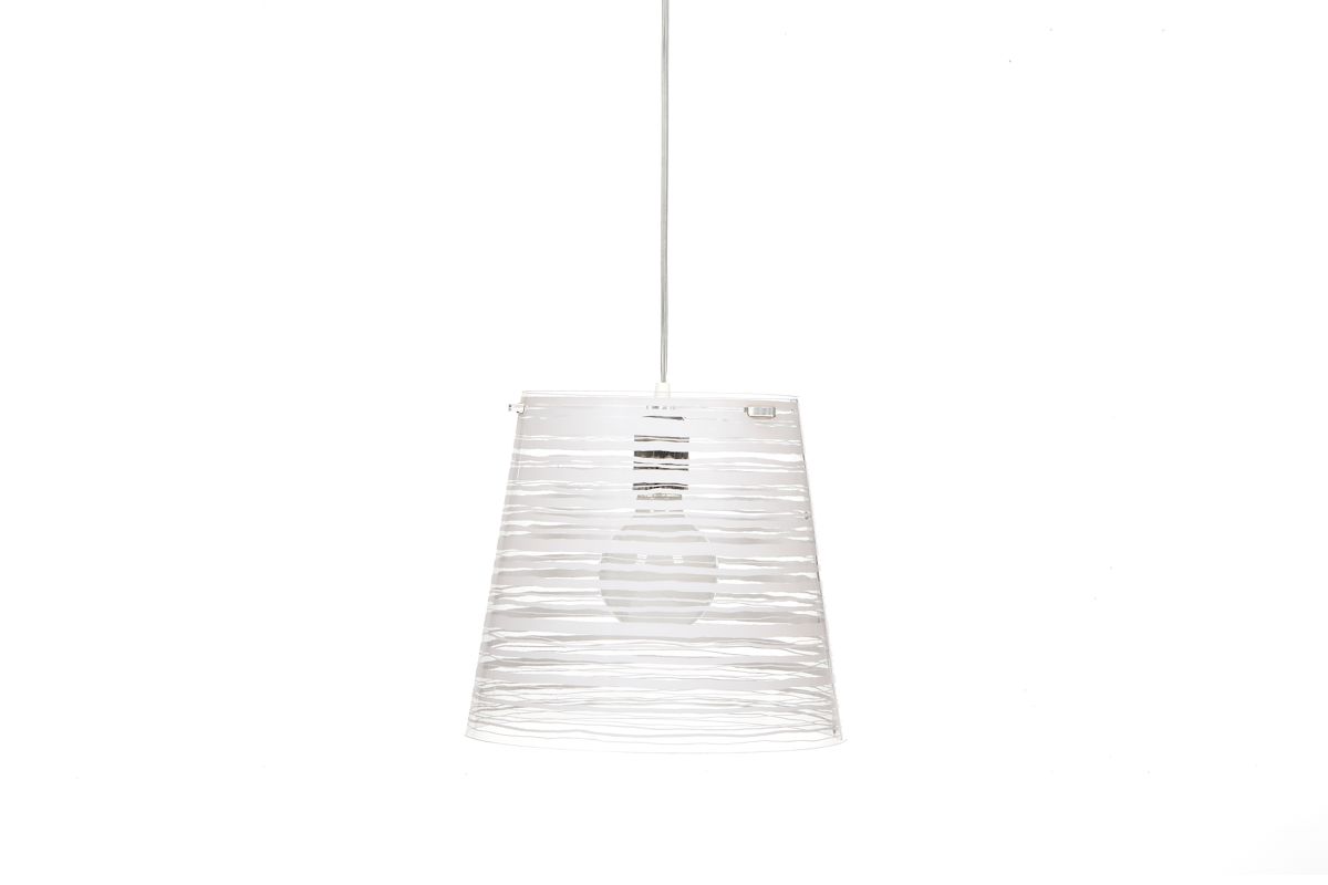 Sospensione con paralume conico in policarbonato trasparente decorato con tecture nei colori bianco, nero, oro, argento. Filo di 150cm. Diametro 42cm.