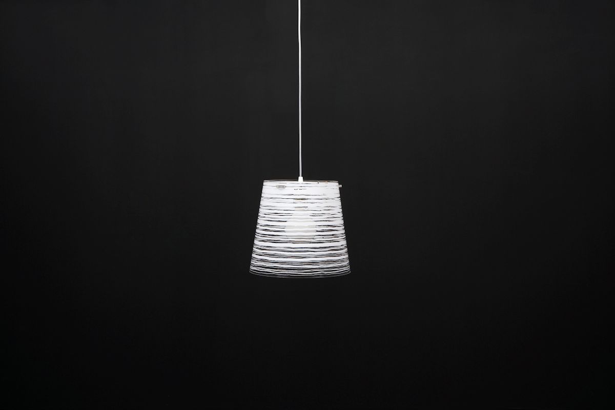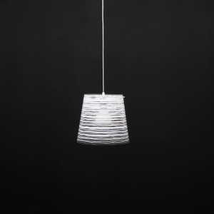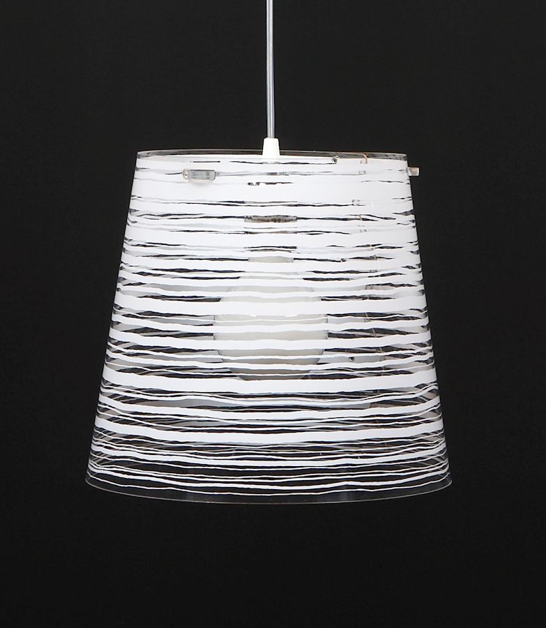 Sospensione con paralume conico in policarbonato trasparente decorato con tecture nei colori bianco, nero, oro, argento. Filo di 150cm. Diametro 30cm.