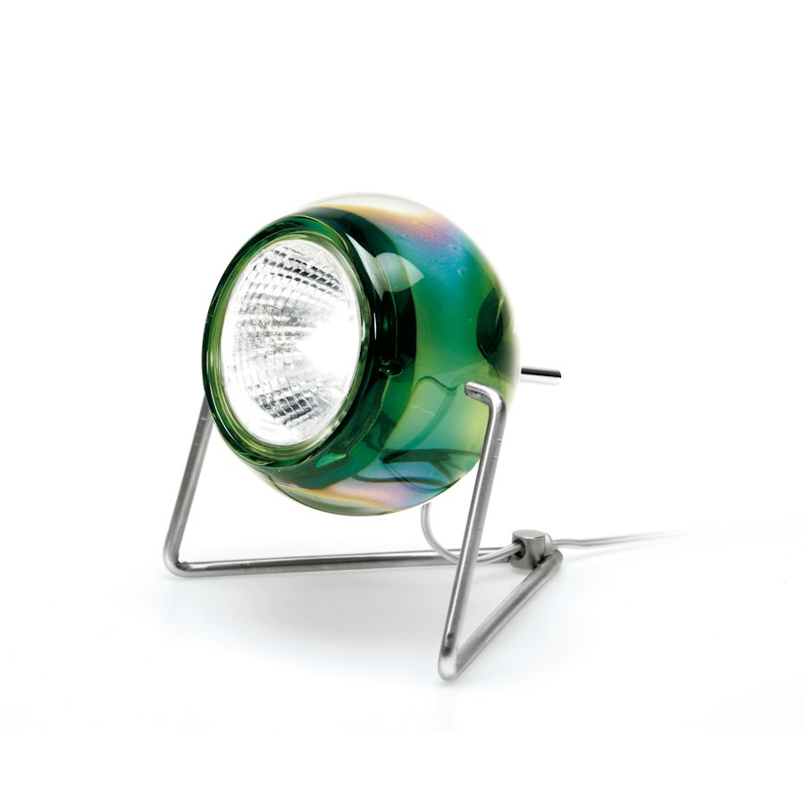 Lampada da tavolo della collezione Beluga di Fabbian disegnata da Marc Sadler con diffusori in cristallo al piombo 24% trasparenti o verniciati. La struttura metallica e' in cromo lucido. Disponibile in differenti colori ha la possibilita' di montare sia una lampadina dicroica che una fonte luminosa a LED.