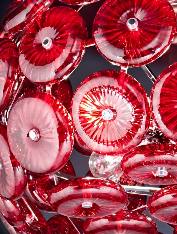 Lampada da Terra (piantana) con struttura in metallo cromato e 36 dischi decorativi in cristallo Ciliegia. Disponibile nei seguenti colori: trasparente, bianco, nero, rosso ciliegia, lilla, ambra, magenta e foglia d'oro. La lampada ha un'altezza di 170cm per un diametro di 45cm.