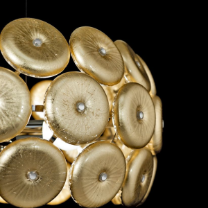 Lampada da Terra (piantana) con struttura in metallo cromato e 36 dischi decorativi in cristallo Foglia Oro. Disponibile nei seguenti colori: trasparente, bianco, nero, rosso ciliegia, lilla, ambra, magenta e foglia d'oro. La lampada ha un'altezza di 170cm per un diametro di 45cm.