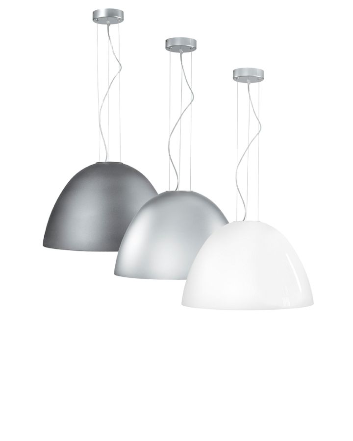 Lampada s sospensione (lampadario) disegnato da Enzo Panzeri nel 2002 con montatura grigio metallizzato e diffusore in vetro soffiato bianco o decorato nero del diametro di 50 centimetri. Disponibile su richiesta anche con sorgente luminosa agli alogenuri metallici. Contattare Genoalamp per disponibilit? e prezzi della versione agli alogenuri metallici.