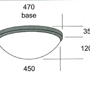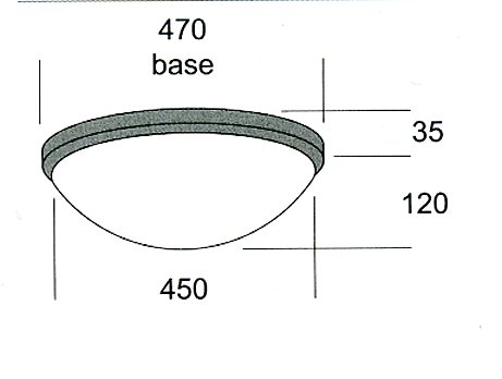 Lampada da soffitto (plafoniera) o da parete (applique) 340-23100 con diffusore in vetro soffiato opale triplex satinato con sistema di aggangio a baionetta. Base in policarbonato autoestinguente. Fascia in metallo cromato e guarnizione in silicone. Indice di protezione IP65. DIametro 45 centimetri.