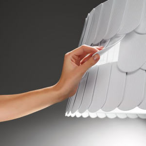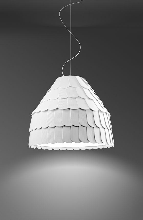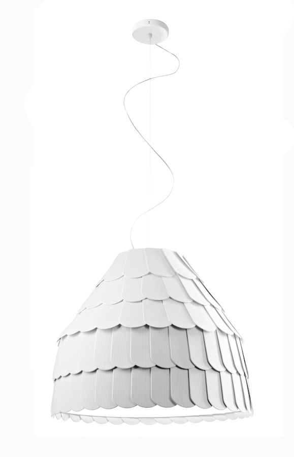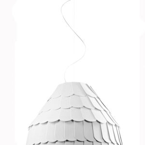 Nuova lampada a sospensione (lampadario) di Fabbian disegnata da Benjamin Hubert costruita con scaglie in materiale gommoso remirigido che ricoprono il telaio. La parte inferiore e' chiusa da un disco diffusore in polimetilmetacrilato. Disponibile anche nei colori grigio antracite, arancione e verde chiaro. Contattare Genoalamp per eventuali disponibilita' e prezzi