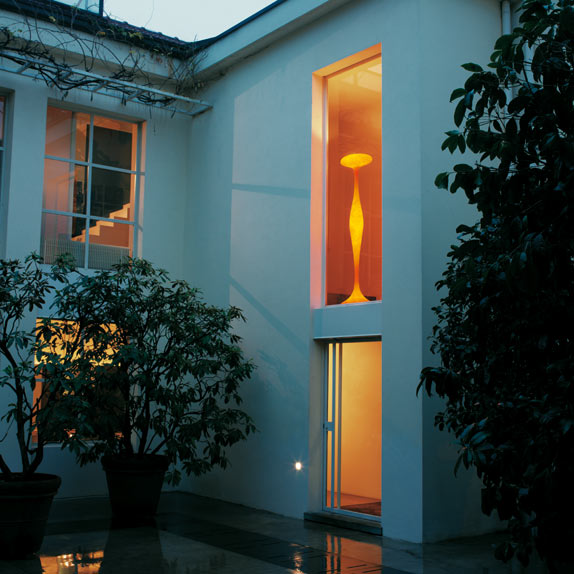 Lampada da terra E.T.A. disegnata da Guglielmo Berchicci nel 1996 con corpo diffusore in vetroresina ecologica lavorato a mano, struttura interna in metallo (rimovibile per la sostituzione dlle lampadine) e dimmer. Altezza 200cm larghezza 40cm