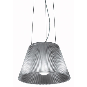 Romeo Moon S1 Sospensione con Diffusore interno in vetro borosilicato pressato con finitura acidata. Diffusore esterno in vetro trasparente pressato. Il supporto diffusore è in policarbonato trasparente stampato ad iniezione. Schermo antipolvere in policarbonato trasparente fustellato. Rosone in ABS bianco stampato ad iniezione, ed attacco a soffitto di acciaio stampato e zincato. Cavi di sospensione di acciaio. Diam.34cm