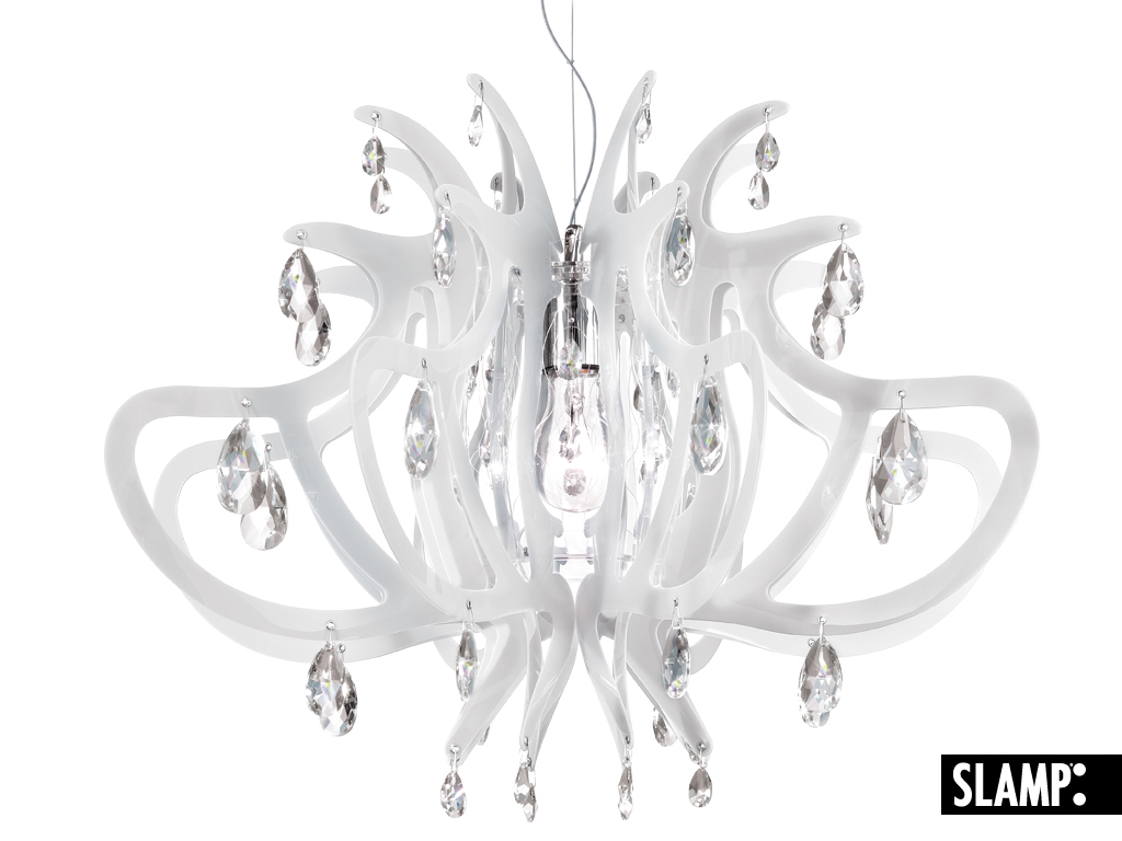 Lampada a sospensione disegnata da Nigel Coates per Slamp. Rimanda alla lingerie di seta e alle trasparenze, ma in maniera inedita e decisamente contemporanea. All'eleganza delle forme abbina scelte cromatiche di gusto. Il risultato è sempre raffinato e seducente, anche grazie ai preziosi pendenti di cristallo che la rendono adatta a una camera da letto dal sapore romantico. Diam.66cm H. 47cm.