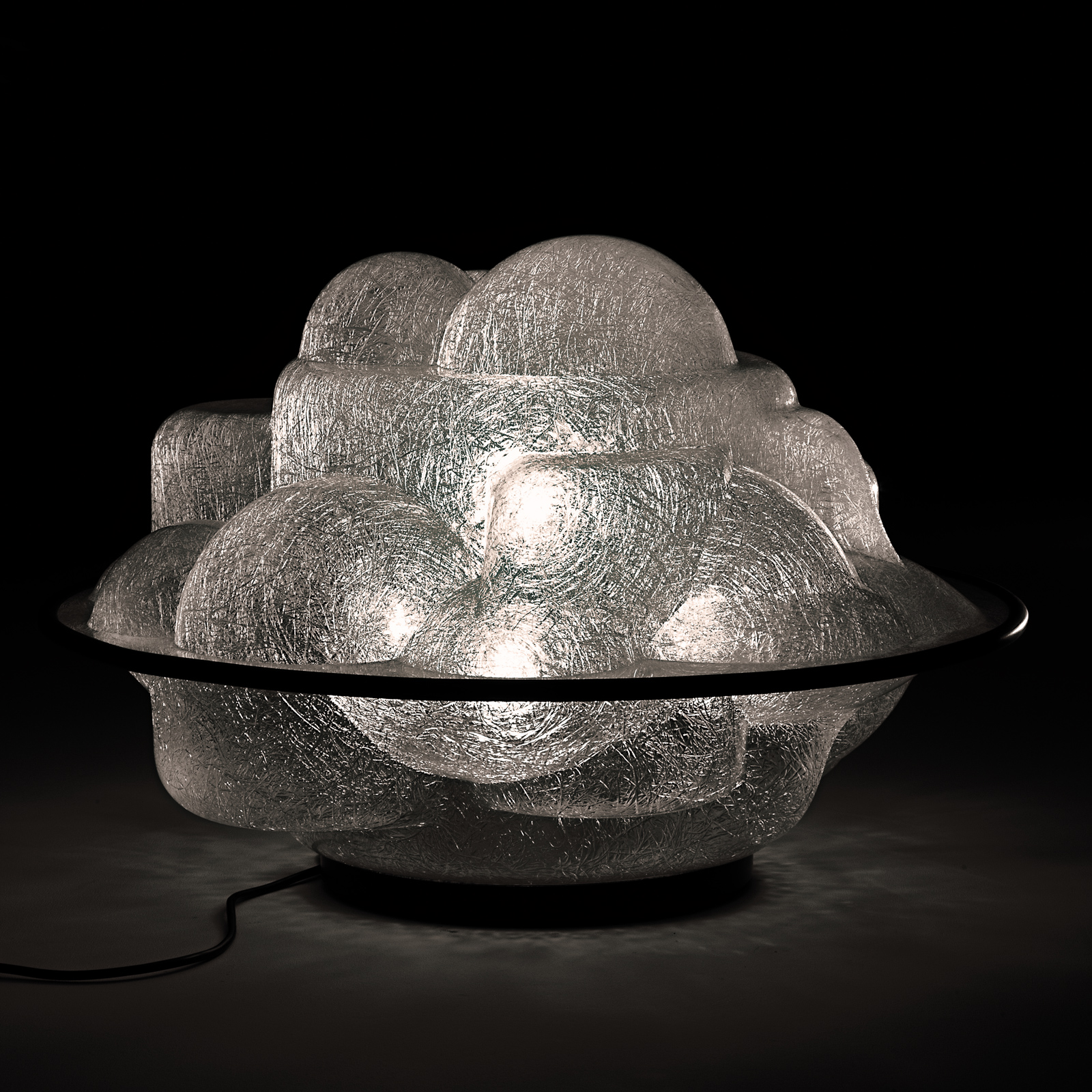 LAMPADA DA TAVOLO A LUCE DIFFUSA. DIFFUSORE IN METACRILATO TRASPARENTE E POLIESTERE CON FIBRA DI VETRO, COLORE BIANCO GHIACCIO. ANELLO DI CONGIUNZIONE IN GOMMA NERA, BASE IN METALLO LACCATO NEL COLORE NERO.