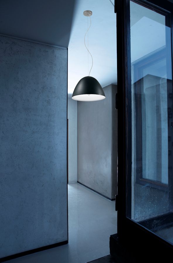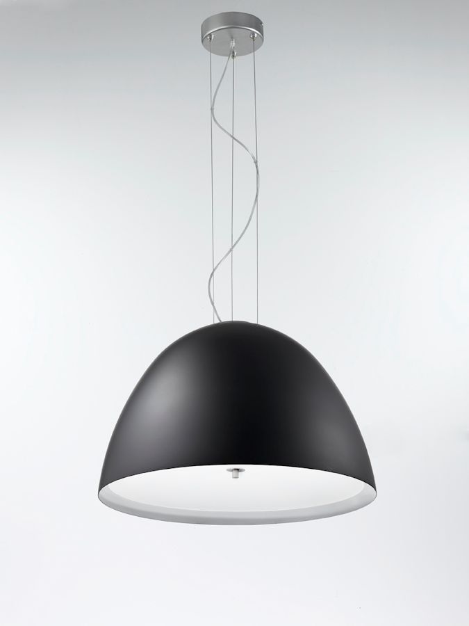 Lampada s sospensione (lampadario) disegnato da Enzo Panzeri nel 2002 con montatura grigio metallizzato e diffusore in vetro soffiato bianco o decorato nero del diametro di 60 centimetri. Disponibile su richiesta anche con sorgente luminosa agli alogenuri metallici. Contattare Genoalamp per disponibilit? e prezzi della versione agli alogenuri metallici. Alimentatore elettronico incluso