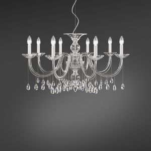 Lampada a sospensione (lampadario) con montatura in metallo cromato e 6 bracci in cristallo trasparente. Disponibile con goccie in Cristallo Swarovski Strass Trasparente o Nero oppure in Cristallo Swarovski Spectra Trasparente. La lampada ha un diametro di 70 centimetri ed un'altezza di 44 centimetri. L'altezza da terra e' regolabile.