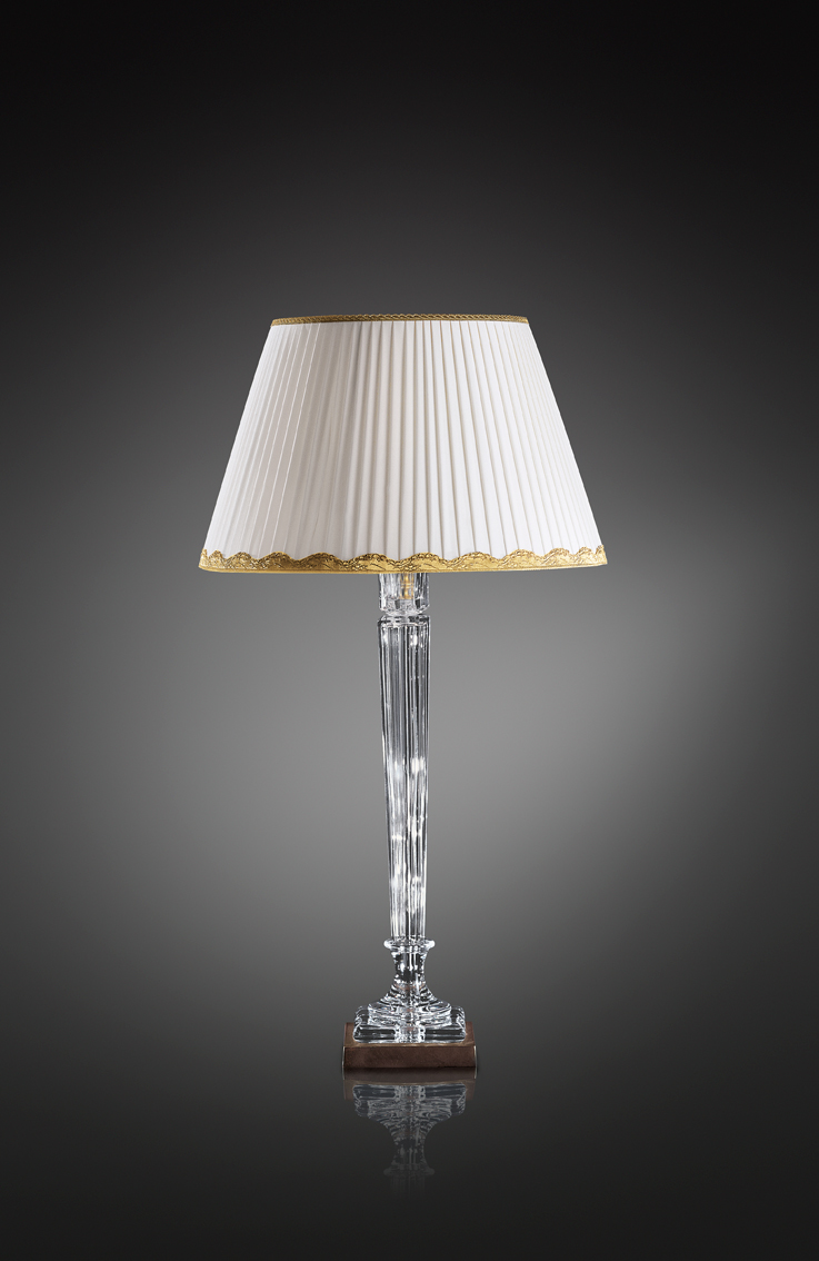 Lampada da tavolo con base in vetro e diffusore in tessuto beige. L'altezza della lampada e' di 73 centimetri.