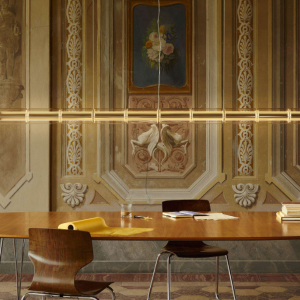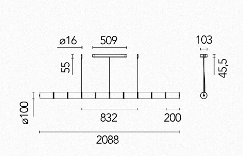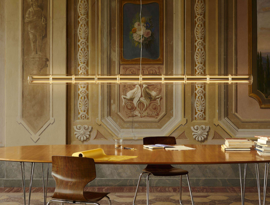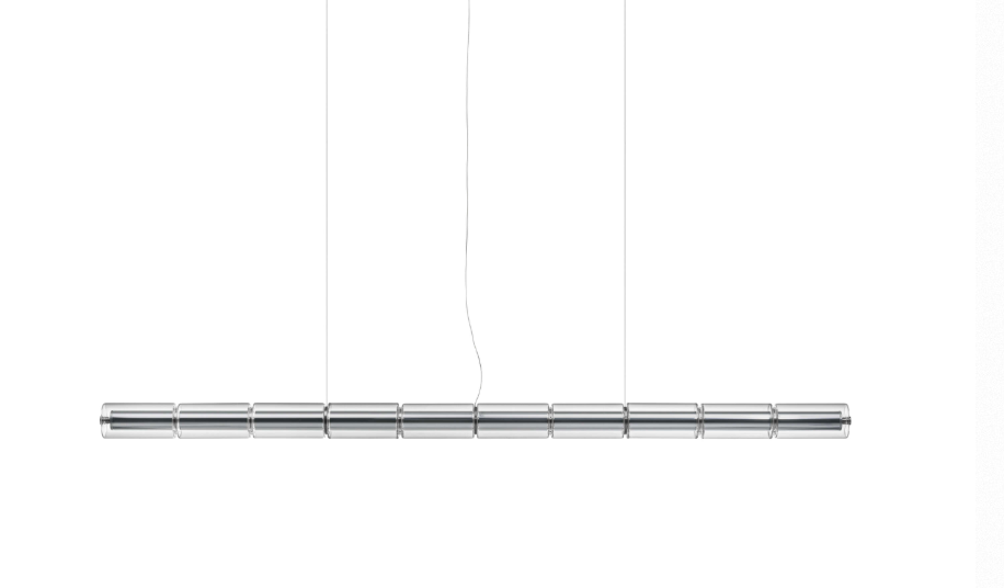 Flos Luce Cilindrica S2 è una lampada a sospensione a luce diffusa lunga 208 cm, caratterizzata da 10 cilindri in vetro borosilicato che schermano il corpo luminoso orizzontale. Il profilo in alluminio estruso lucido integra due strisce LED per l’emissione verso l’alto e verso il basso, creando un’illuminazione funzionale e decorativa allo stesso tempo. Il dimmer tattile integrato permette un controllo indipendente dell’emissione diretta e indiretta, offrendo grande flessibilità fra luce tecnica e luce d’atmosfera. La sequenza dei cilindri in vetro, separati da distanziali tradizionali, dà ritmo alla composizione e consente installazioni anche in più file parallele nei progetti di interior design più articolati.