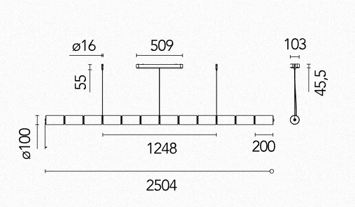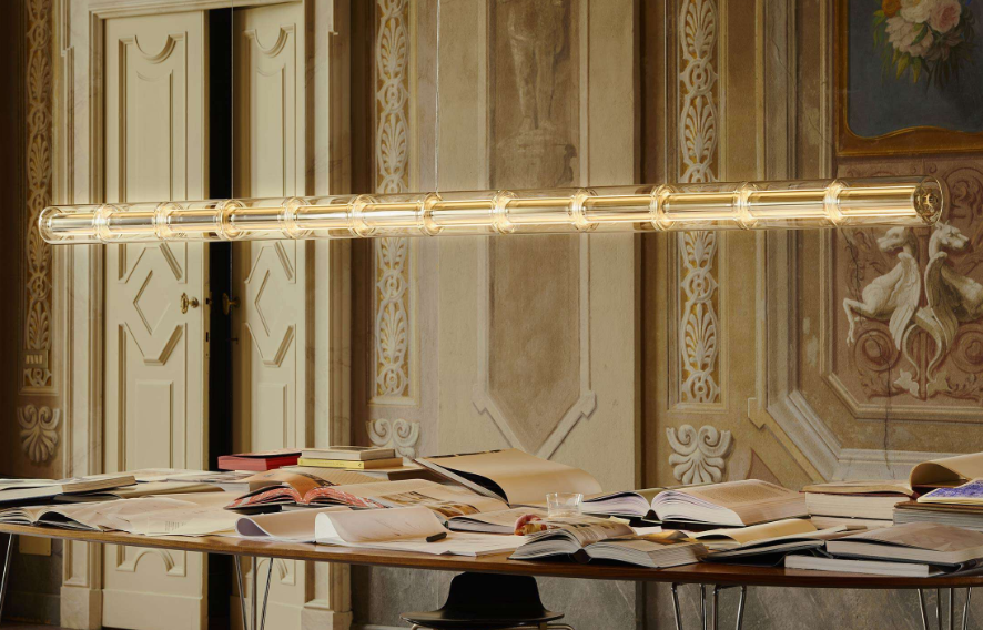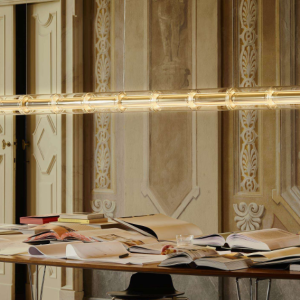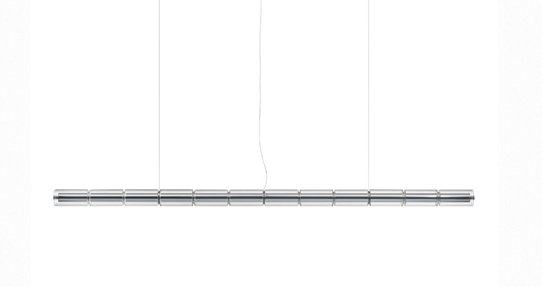 Flos Luce Cilindrica S3 è la versione più lunga della famiglia, con 250 cm di sviluppo orizzontale e 12 cilindri in vetro borosilicato che avvolgono il corpo in alluminio estruso lucido. Due strisce LED, una orientata verso l’alto e una verso il basso, generano una luce diffusa ampia e uniforme, ideale per tavoli importanti, grandi living e spazi contract. Il dimmer tattile integrato consente un controllo indipendente dell’emissione luminosa diretta e indiretta, così puoi passare da un’illuminazione più funzionale a una più morbida e scenografica. La successione dei cilindri, intervallati da distanziali tradizionali, rende la sospensione un vero elemento architettonico, installabile anche in più file parallele per composizioni di forte impatto visivo.