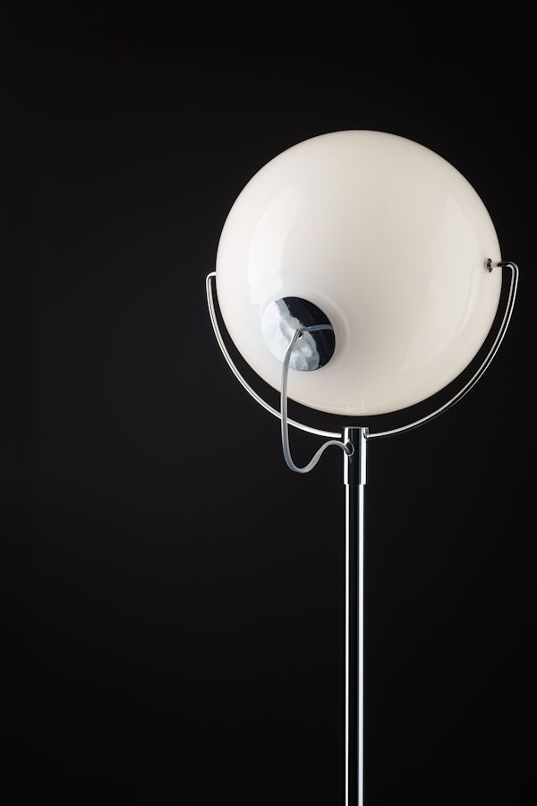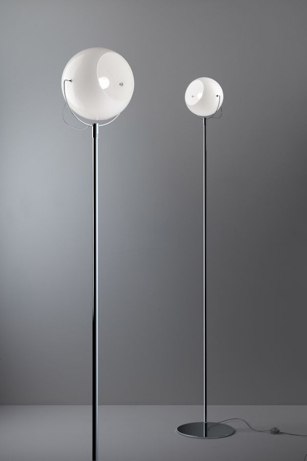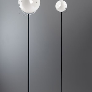 Splendida lampada da terra della serie Beluga con struttura in metallo cromato lucido e diffusore orientabile in cristallo bianco lucido.