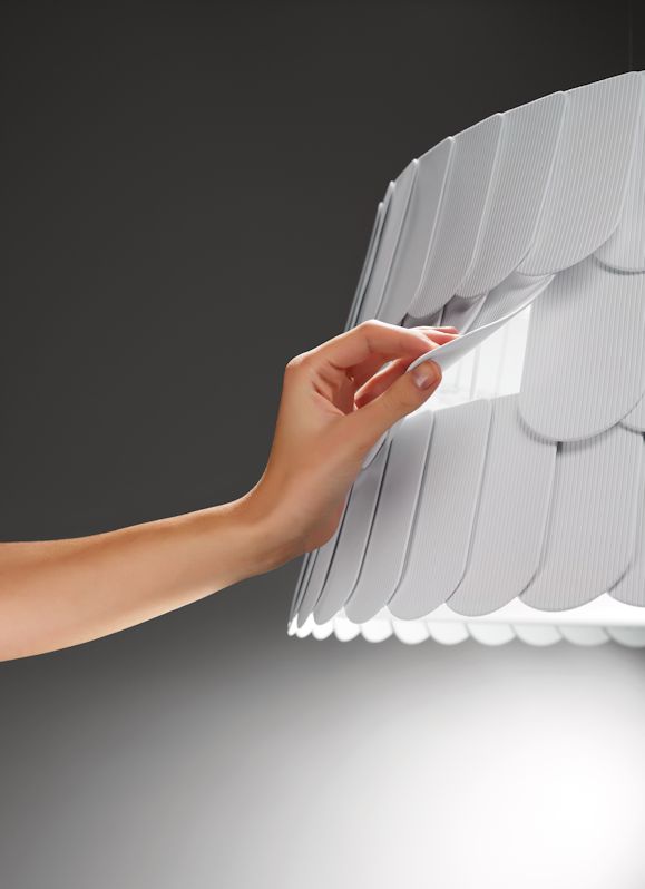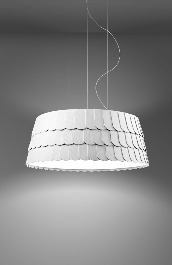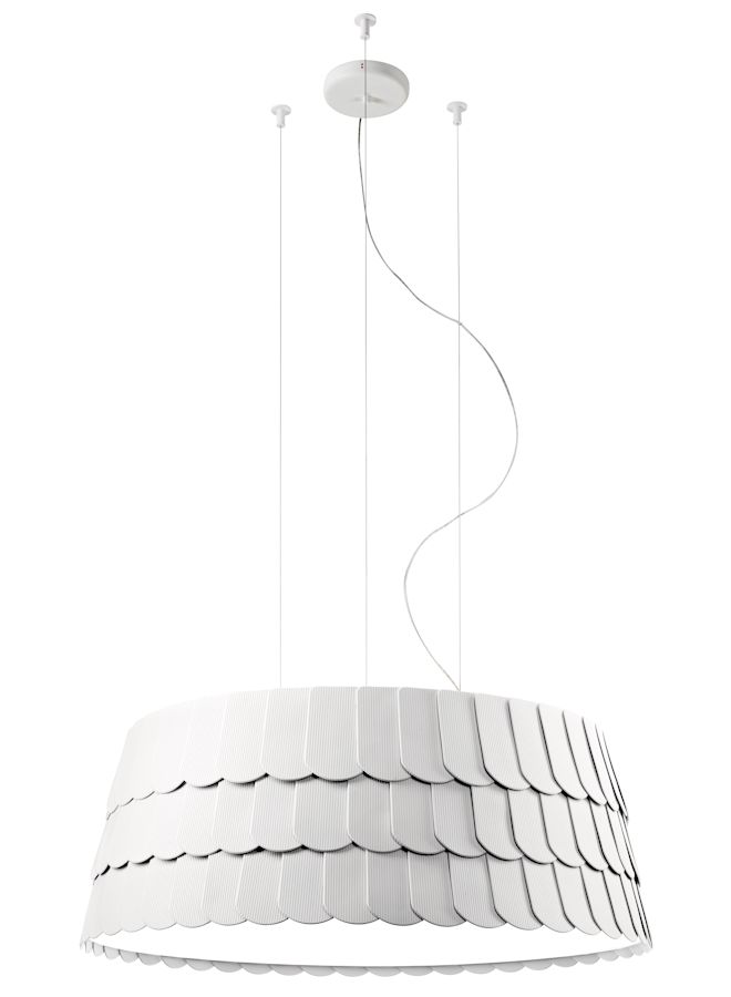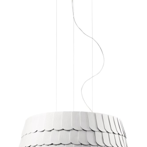 Nuova lampada a sospensione (lampadario) di Fabbian disegnata da Benjamin Hubert costruita con scaglie in materiale gommoso remirigido che ricoprono il telaio. La parte inferiore e' chiusa da un disco diffusore in polimetilmetacrilato. Disponibile anche nei colori grigio antracite, arancione e verde chiaro. Contattare Genoalamp per eventuali disponibilita' e prezzi